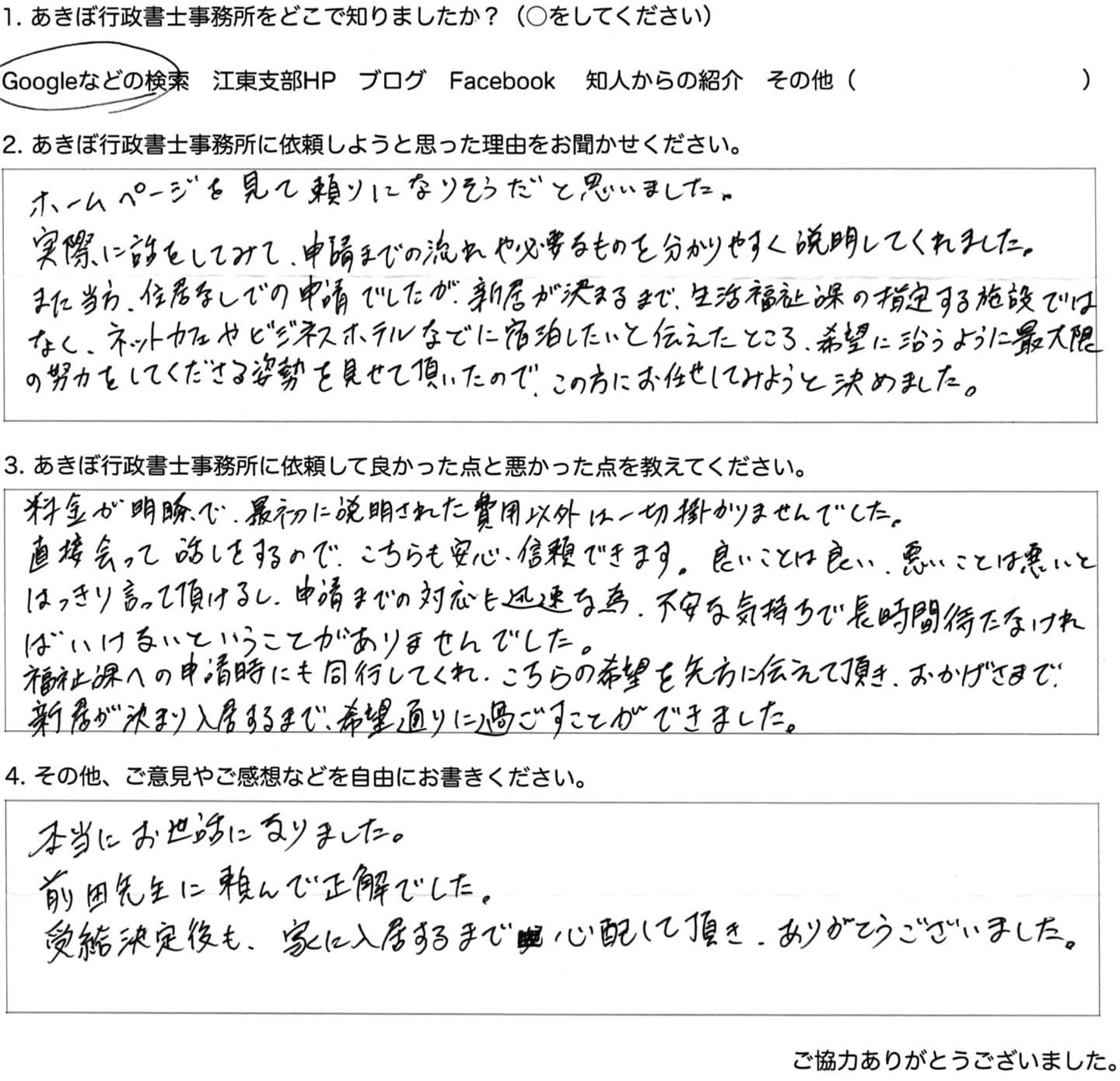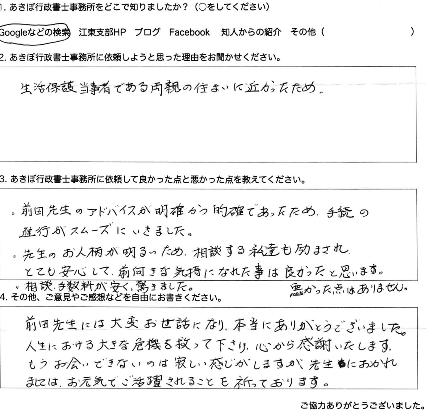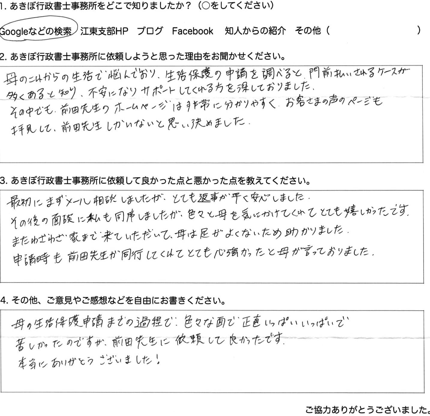 母の生活保護申請までの過程で、色々な面で正直いっぱいいっぱいで苦しかったのですが、前田先生に依頼してよかったです。本当にありがとうございました!