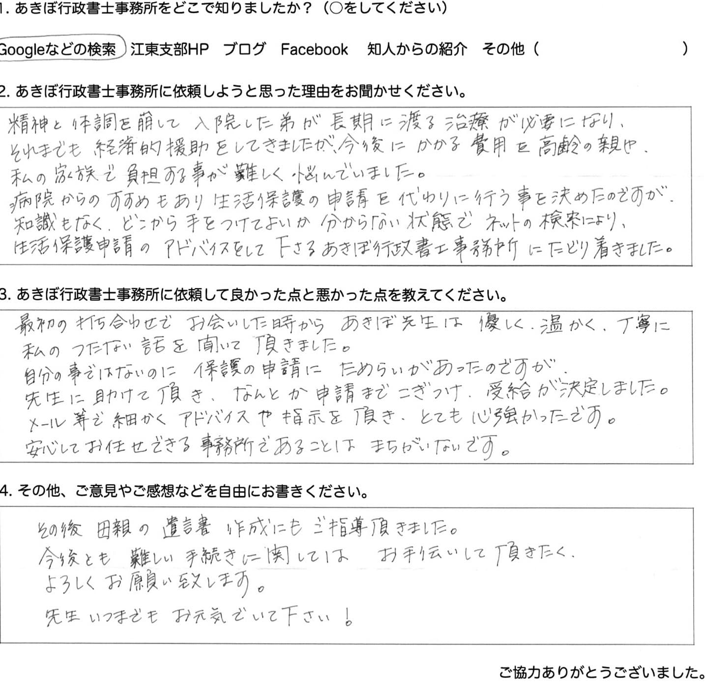 病院からの勧めもあり、生活保護の申請を代わりに行う事を決めたのですが、知識もなく、どこから手をつけて良いか分からない状態でネットの検索により、生活保護申請のアドバイスをしてくださるあきぼ行政書士事務所にたどり着きました。