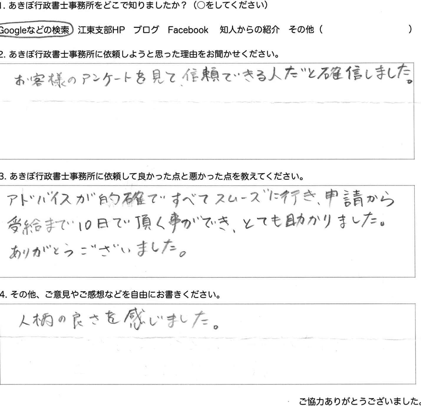アドバイスが的確で、すべてスムーズに行き、申請から受給まで10日で頂く事ができ、とても助かりました。