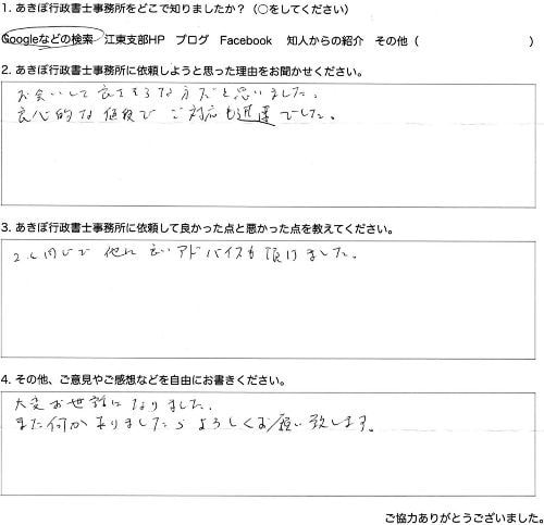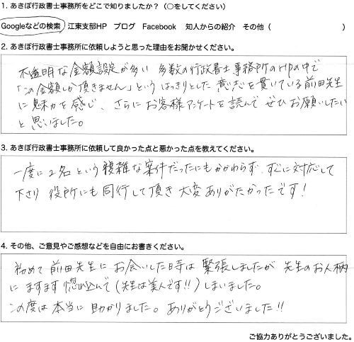 不透明な金額設定が多い多数の行政書士事務所のHPの中で「この金額しか頂きません」というはっきりとした意志を貫いている前田先生に魅力を感じ、さらにお客様アンケートを読んでぜひお願いしたいと思いました。
